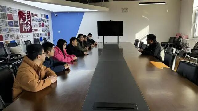 随后,教师团队前往山东百合光年影视传媒有限公司调研。通过座谈,教师们进一步把握了影视传媒行业对艺术设计人才在数字艺术表达、创意构思等方面的具体需求,并就“影视美术设计课程嵌入”校企合作课程达成初步合作意向,为艺术设计专业教学内容的优化与升级提供了重要参考。