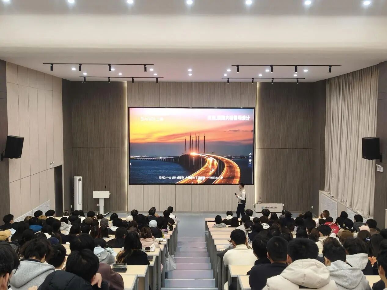 “仰望星空”,是宋磊先生对青年学子的另一番寄语。他指出,在快速变化的时代背景下,青年人不仅要有扎实的专业技能,更要有开阔的视野和创新的思维。他通过分享自己在城市照明规划、建筑照明、新媒体艺术及文旅夜游等领域的创新实践,展示了如何通过科技与艺术的融合,创造出既实用又美观的光电作品,为城市增添光彩。