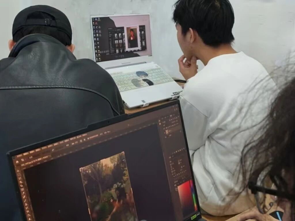 (图示:后期处理环节,学生们专注地进行图片精修)