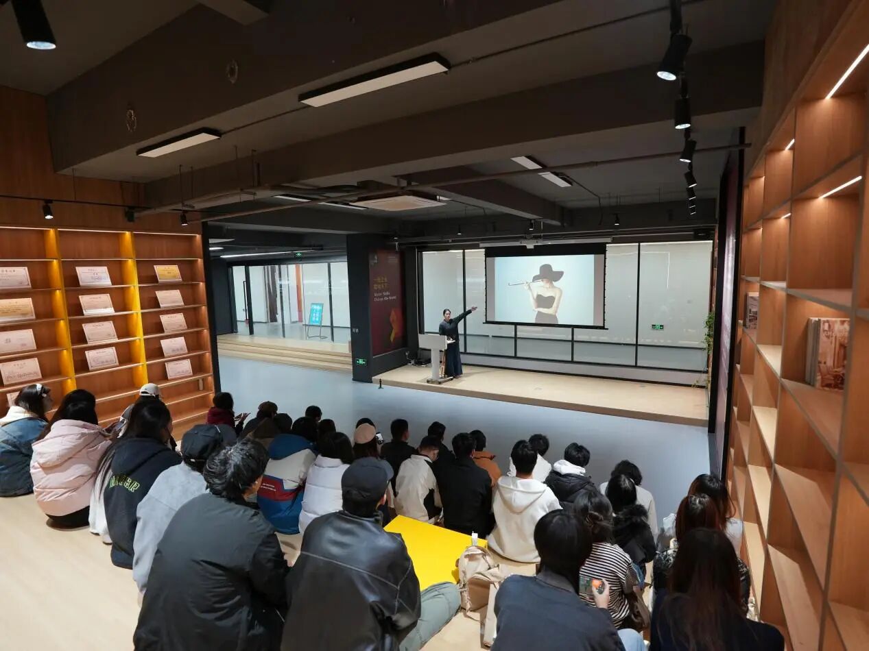 (图示:结课展览现场,师生们认真观看作品汇报)