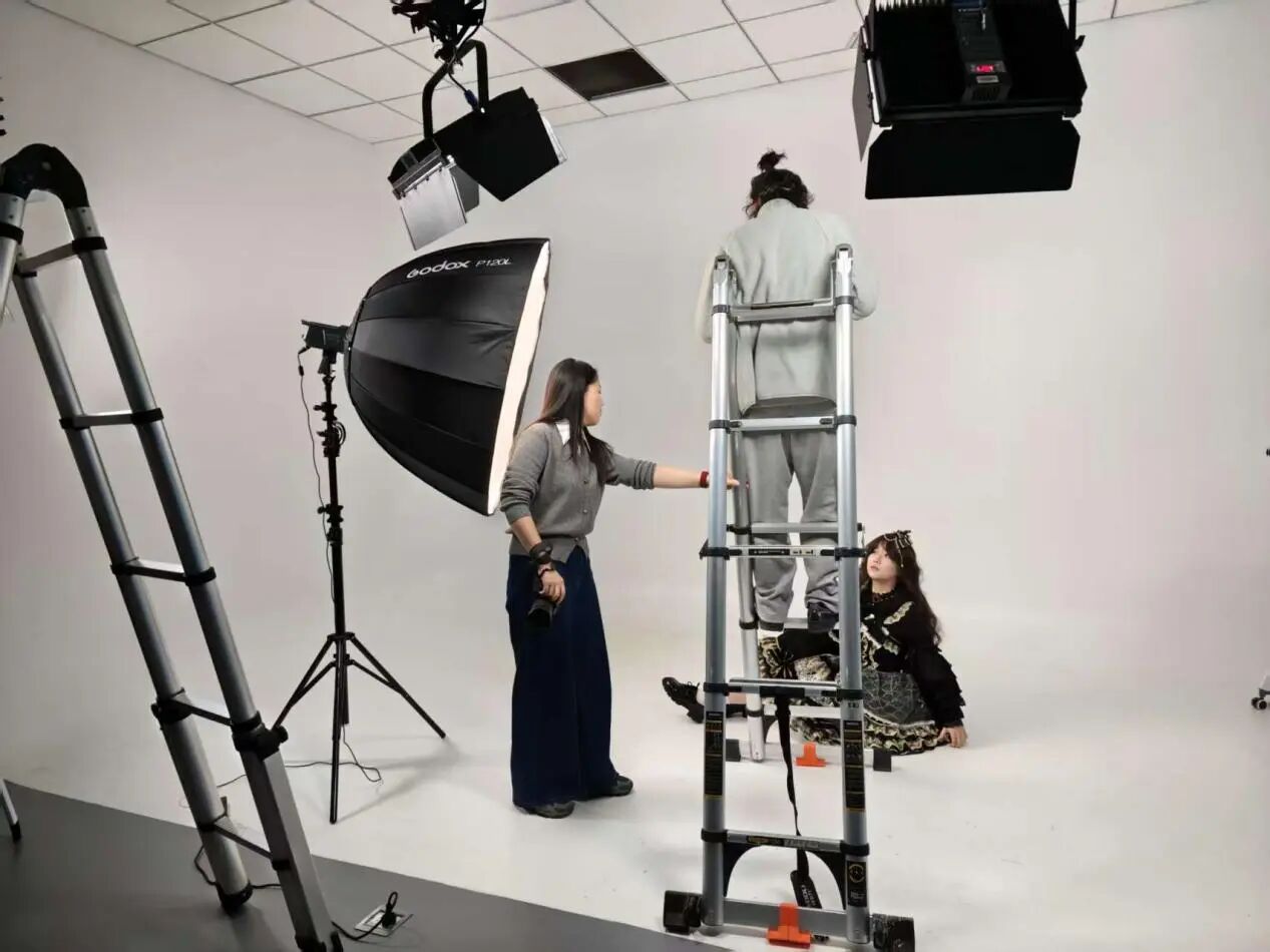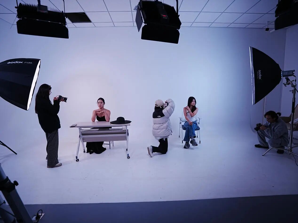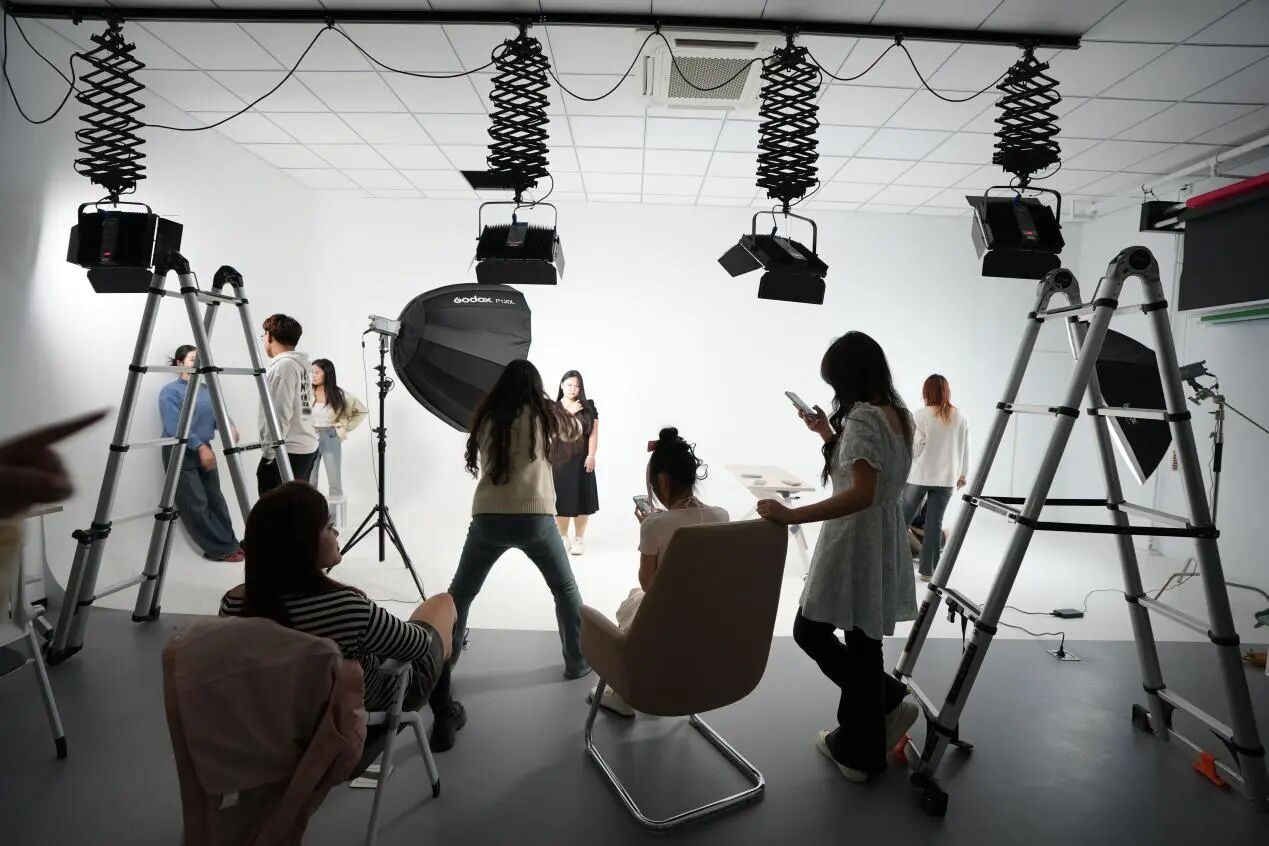 (图示:摄影棚内,学生正在教师指导下进行拍摄创作)