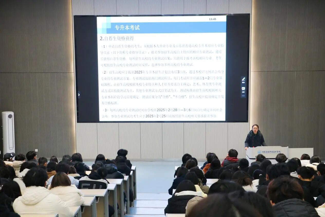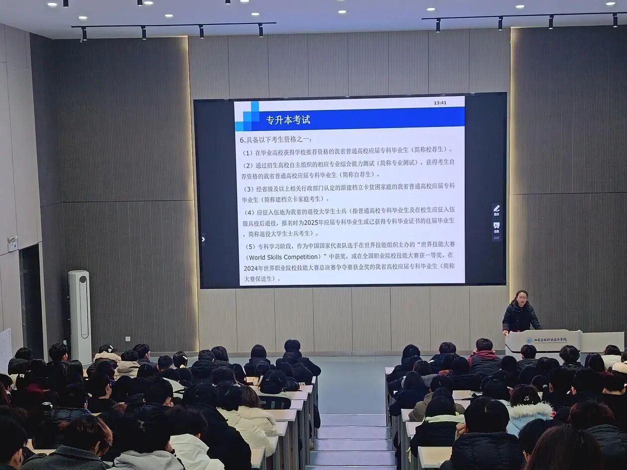 对暂无升学意愿的学生,李老师梳理了在校期间可以考取的职业技能证书,鼓励学生充分利用课余时间认真学习,夯实专业基础,考取相应证书。针对有意向进入事业单位工作的同学,李洪方老师还分享了山东省事业单位的招聘资讯,并鼓励专科同学关注基层岗位的招聘机会。