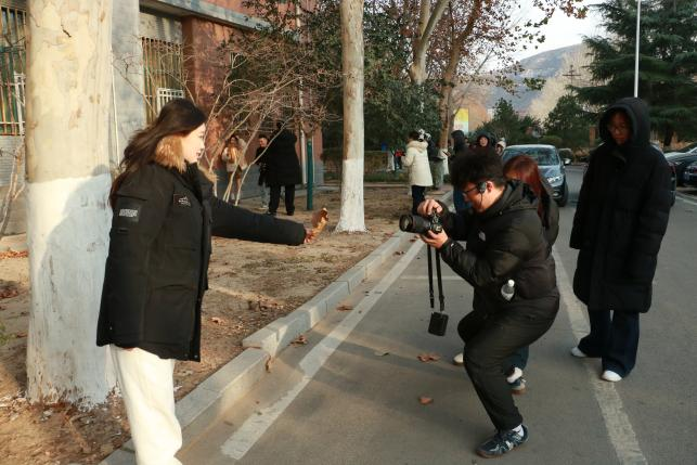 拍摄体验环节将同学们分成几组,领取佳能相机后在指定区域进行拍摄创作。两位负责人巡回指导,及时给予学生们拍摄建议与技术支持。学生们充分发挥创意,捕捉下了许多精彩瞬间。